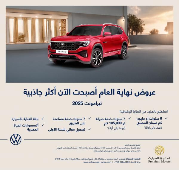 أطلقت فولكس واجن عُمان، مُمثلةً بالمتميزة للسيارات، حملة ترويجية استثنائية بمناسبة نهاية السنة على أشهر طرازاتها من سيارات الـSUV، تيرامونت وطوارق، ما يتيح لعملائها الفرصة لشراء سيارتهم المفضلة بسعر تنافسي، مع باقة من المزايا الإضافية.