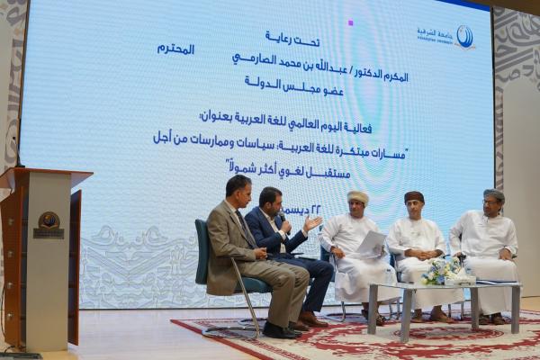 احتفلت جامعة الشرقية ممثلة في كلية الآداب والعلوم الإنسانية باليوم العالمي للغة العربية تحت عنوان "مسارات مبتكرة للغة العربية: سياسات وممارسات من أجل مستقبل لغوي أكثر شمولا"، وذلك تحت رعاية المكرم الدكتور عبدالله بن محمد الصارمي عضو مجلس الدولة، وبمشاركة نخبة من الأكاديميين والباحثين والمهتمين باللغة العربية.