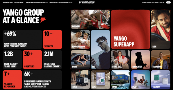 وعكس التقرير الافتتاحي تطور مجموعة يانغو من خدمة واحدة لطلب سيارات الأجرة في عام 2018 إلى منظومة رقمية متعددة الخدمات تدعم ملايين الأشخاص يوميًا.