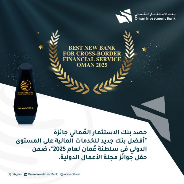 فاز بنك الاستثمار العُماني بجائزة "أفضل بنك جديد للخدمات المالية على المستوى الدولي في سلطنة عُمان لعام 2025" من مجلة الأعمال الدولية، ضمن جوائزها السنوية للتميّز في القطاع المالي.