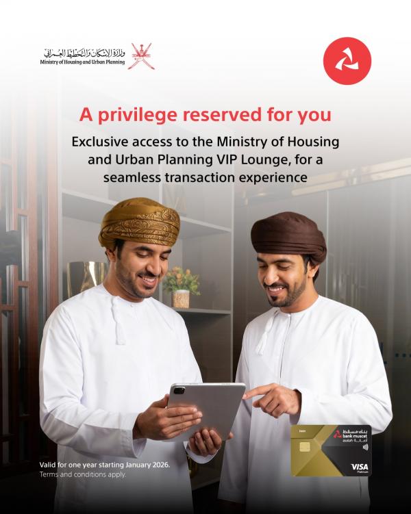 أعلن بنك مسقط- المؤسسة المالية الرائدة في سلطنة عُمان- تقديم عرض حصري لزبائن أصالة للأعمال المصرفية المميزة يتضمن فرصة الدخول إلى القاعة المميزة لوزارة الإسكان والتخطيط العُمراني، حيث تُوفر هذه القاعة خدمات مُريحة وسريعة وتقدم دعمًا كاملاً لمُتابعة مختلف الخدمات والمعاملات التي تقدمها الوزارة.