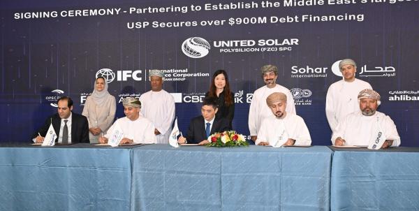 وقعت شركة "يونايتد سولار" القابضة ممثلة في شركة البولي سيليكون المتّحدة للطاقة الشمسية التابعة لها، أمس بمسقط على تأمين تمويل بقيمة 185 مليون ريال عُماني ما يعادل 480 مليون دولار أمريكي كقروض طويلة الأجل مع مؤسسة التمويل الدولية والبنوك الشريكة لها، إلى جانب تمويل بأكثر 154 مليون ريال عُماني ما يعادل 400 مليون دولار أمريكي من البنوك التجارية المحلية تشمل قروضًا طويلة الأجل وتسهيلات رأس المال التشغيلي.