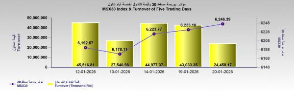 أغلقت بورصة مسقط تعاملات، الثلاثاء، على ارتفاع؛ حيث أنهى مؤشر السوق الرئيسي MSX30 الجلسة عند مستوى 6,246.39 نقطة، مرتفعًا بمقدار 13.3 نقطة وبنسبة 0.21% مقارنةً بآخر جلسة تداول.