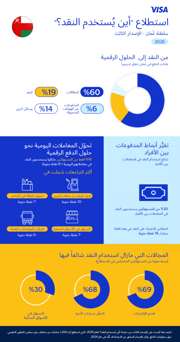 تواصل عادات الدفع في سلطنة عُمان تطوّرها بوتيرة متسارعة، مع اعتماد المستهلكين على وسائل الدفع الرقمية الأسرع والأكثر أمانًا، ويُظهر الإصدار الثالث من استطلاع Visa "أين يُستخدَم النقد؟"، أنَّ 64% من المستهلكين في السلطنة يعتمدون بشكل أساسي على وسائل الدفع غير النقدية، أي أنهم ينفّذون معظم معاملاتهم باستخدام البطاقات أو الأجهزة المحمولة، وهو ما يمثّل زيادة بنسبة 15% مقارنة بالعام السابق، ما يعكس توجهًا واضحًا نحو تقليل الاعتماد على النقد.