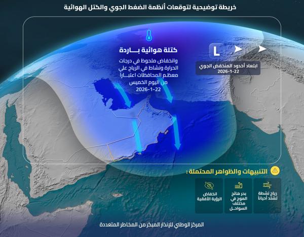 أعلنت الأرصاد العُمانية عن تأثر سلطنة عُمان بكتلة هوائية باردة مع نشاط للرياح، وذلك اعتبارًا من اليوم الخميس.