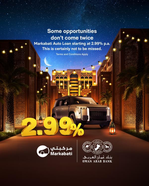 أطلق بنك عُمان العربي حملته الرمضانية لقروض السيارات لعام 2026، مسلطًا الضوء على منتج التمويل "مركبتي" بأسعار فائدة تنافسية تبدأ من نسبة 2.99% سنويًا. وتستمر الحملة لفترة محدودة من 1 فبراير حتى 31 مارس 2026، تلبيةً للطلب المتزايد قبل وخلال وبعد شهر رمضان، بما يمنح العملاء فرصة مواتية لتمويل سياراتهم الجديدة بكل ثقة ويسر.