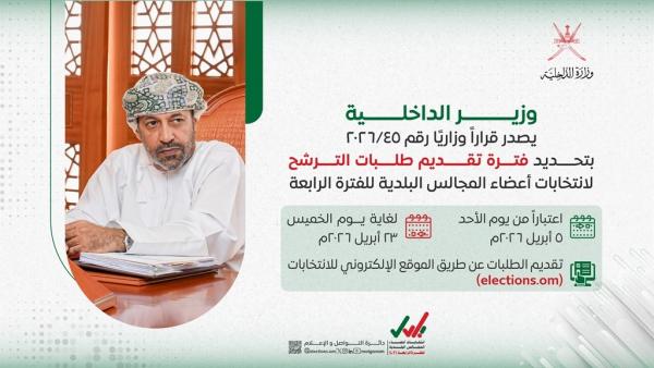 أصدر معالي السيد حمود بن فيصل البوسعيدي وزير الداخلية القرار الوزاري رقم (45/2026) بتحديد فترة تقديم طلبات الترشح لانتخابات أعضاء المجالس البلدية للفترة الرابعة؛ وذلك اعتبارًا من يوم الأحد 5 أبريل ولغاية يوم الخميس 23 أبريل 2026، ويكون آخر موعد لسحب طلبات الترشح يوم الخميس 29 أكتوبر 2026.