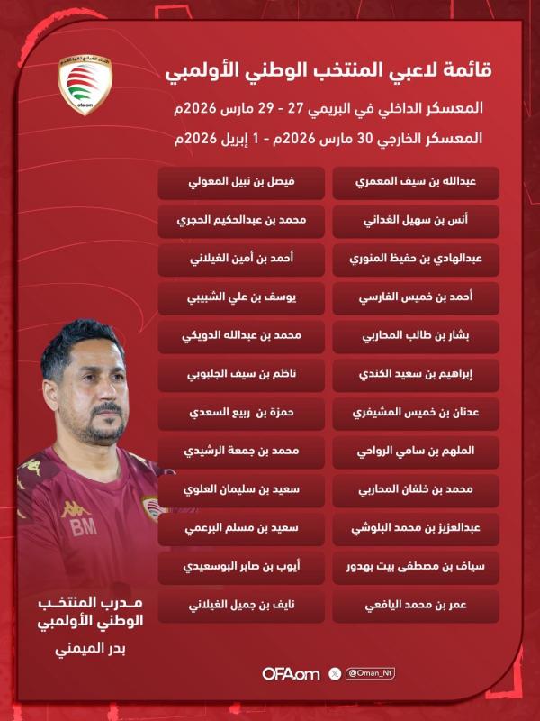 دخل المنتخب الوطني الأولمبي لكرة القدم مرحلة إعداد جديدة، من خلال برنامج تحضيري تضمّن معسكرًا داخليًا في البريمي خلال الفترة من 27 إلى 29 مارس 2026م، أعقبه معسكر خارجي يمتد من 30 مارس إلى 1 أبريل 2026م، وذلك في إطار خطة الجهاز الفني الرامية إلى رفع الجاهزية الفنية والبدنية، والوقوف على مستويات العناصر المختارة قبل الاستحقاقات المقبلة.