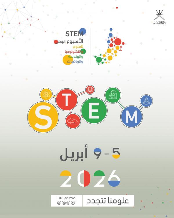 وينتظم الأسبوع الوطني للعلوم (STEM) تحت شعار "علومنا تتجدد"، وذلك خلال الفترة من 5 إلى 9 أبريل الجاري. والأسبوع إحدى المبادرات العلمية الوطنية التي تنفذها وزارة التعليم؛ لتعزيز تعلم العلوم ونشر الثقافة العلمية والتأكيد على أهمية العلوم والابتكار في التقدم العلمي والتكنولوجي المتسارع، ومنصة لتحفيز ودعم المعلمين والطلبة والمهتمين بمجال العلوم والتكنولوجيا والهندسة والرياضيات؛ لتنفيذ مجموعة من الفعاليات والأنشطة في مختلف المجالات العلمية، وتعزيز الشراكة مع المؤسسات المعنية في القطاعين الحكومي والخاص لتنفيذ الفعاليات في مختلف محافظات سلطنة عُمان، لضمان وصول هذه المعرفة العلمية التي تقدم بطابع تفاعلي لشريحة كبيرة من الطلبة والمعلمين والمهتمين من مختلف فئات المجتمع.