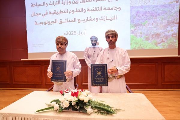 وقّعت وزارة التراث والسياحة مذكرة تعاون مع جامعة التقنية والعلوم التطبيقية لدعم البحث والتعاون العلمي في مجالات النيازك والتراث الجيولوجي ومشاريع الحدائق الجيولوجية بسلطنة عمان. وقع المذكرة من جانب وزارة التراث والسياحة، سعادة المهندس إبراهيم بن سعيد الخروصي وكيل وزارة التراث والسياحة للتراث، فيما وقعها من جانب الجامعة سعادة الدكتور سعيد بن حمد الربيعي رئيس جامعة التقنية والعلوم التطبيقية.