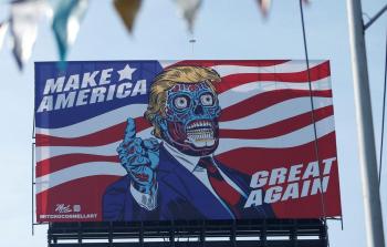 ترامب أزرق وهزيل يظهر على لافتة في المكسيك